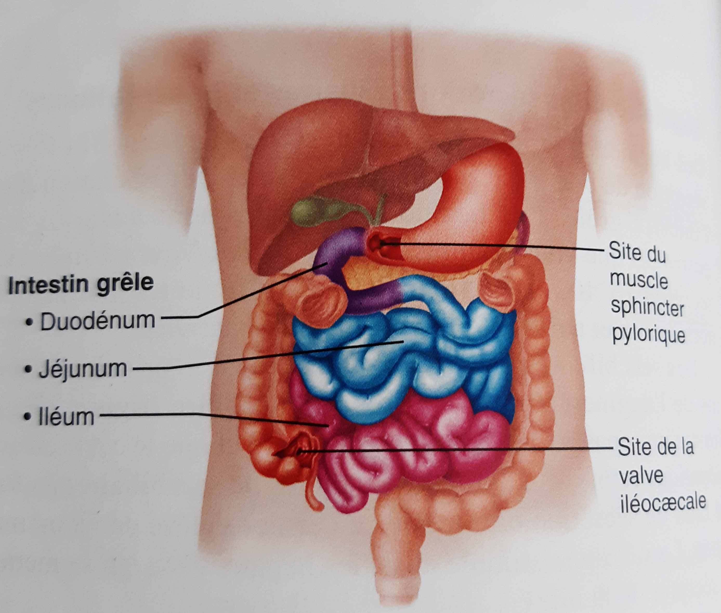 L'intestin grêle et le principal organe de la digestion. C'est dans ses méandres que se déroule l'essentiel de la digestion (avec l'aide de la bile et des enzymes pancréatiques) et que ce produit pratiquement toute l'absorption.