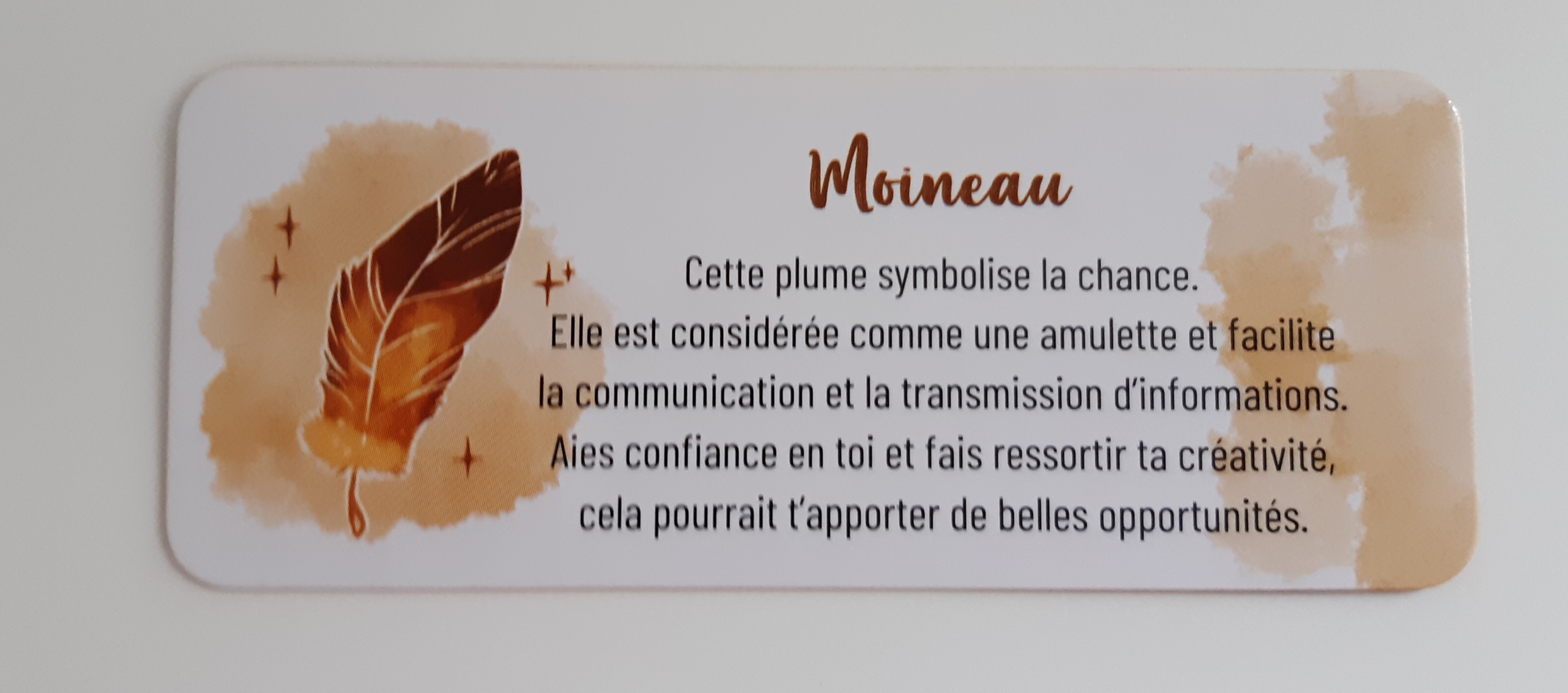 Cette plume symbolise la chance. Elle est considérée comme une amulette et facilite la communication et la transmission d'informations. Aies confiance en toi et fais ressortir ta créativité, cela pourrait t'apporter de belles opportunités.