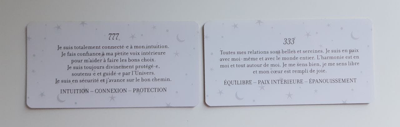 777 : Je suis totalement connecté(e) à mon intuition. Je fais confiance à ma petite voix intérieure pour m'aider à faire les bons choix. Je suis toujours divinement protégé(e), soutenu(e) et guidé(e) par l'Univers. Je suis en sécurité et j'avance sur le bon chemin.