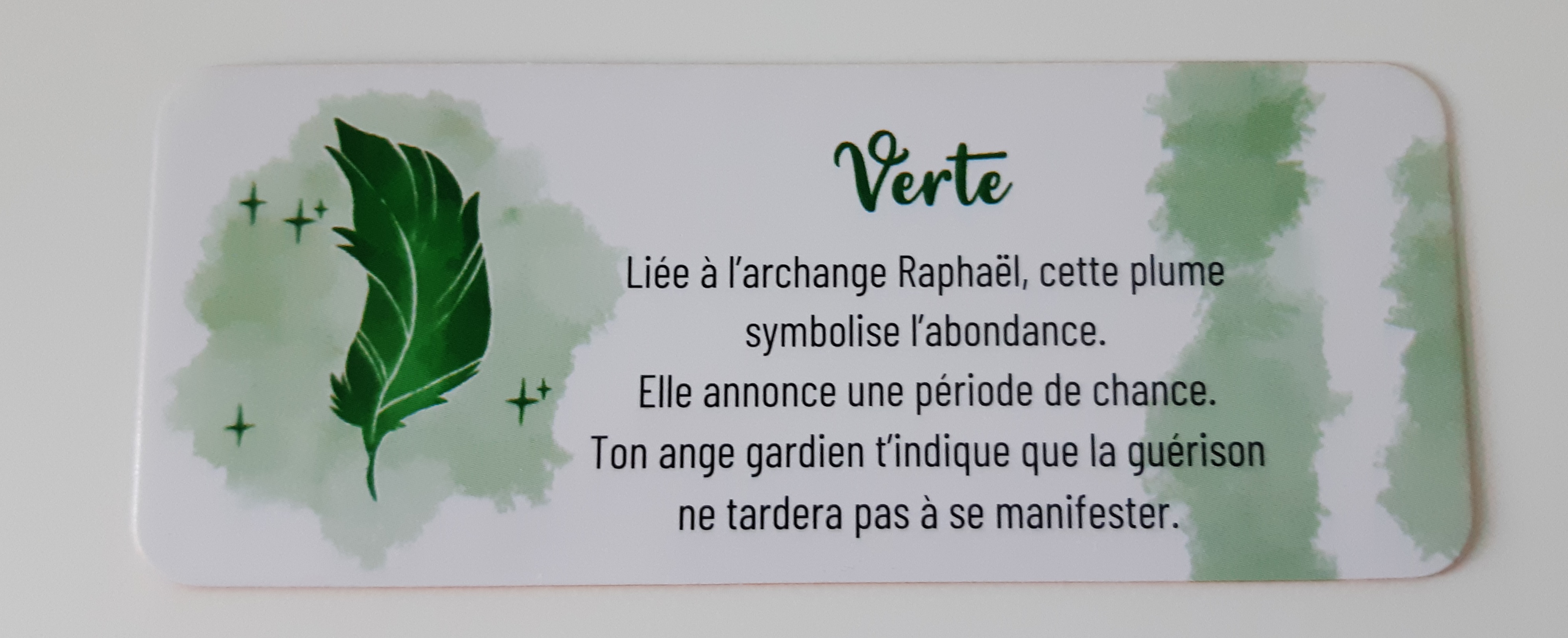Plume Verte : liée à l'archange Raphaël, cette plume symbolise l'abondance. Elle annonce une période de chance. Ton ange gardien qu'indique que la guérison ne tardera pas à se manifester.