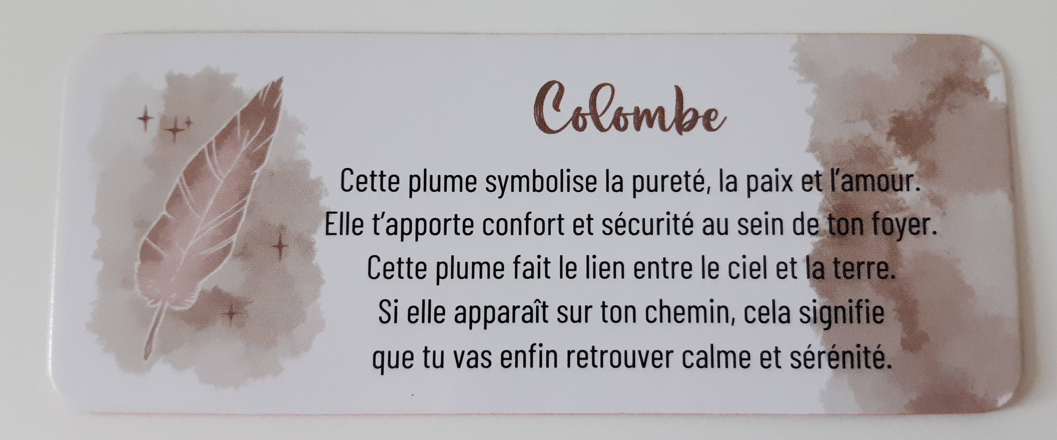 Plume Colombe : cette plume symbolise la pureté, la paix et l'amour. Elle t'apporte confort et sécurité au sein de ton foyer. Cette plume fait le lien entre le ciel et la terre. Si elle apparaît sur ton chemin, cela signifie que tu vas enfin retrouver calme et sérénité.