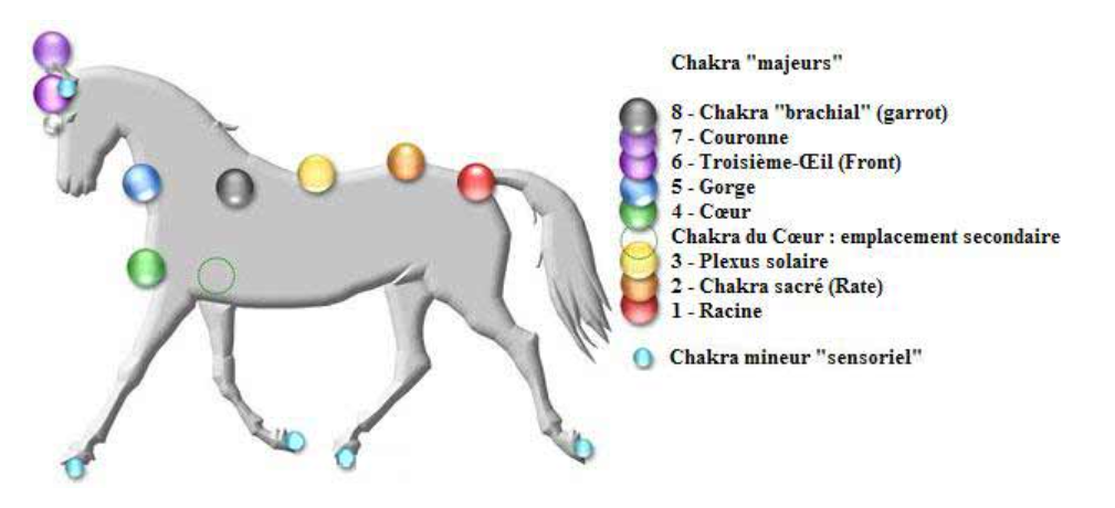 Parties du corps : le chakra brachial régit la poitrine, le cou, les pattes avant, la tête et pour le cheval, il est juste au-dessus de l’endroit où l’encolure rejoint les épaules.